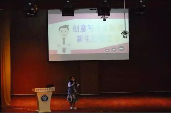 创意写作中心“实验班”的导师们都是当代知名作家,九大作家在“实验班”中驻足指导在全国实属首例。具有文学梦想或才能的你即将有机会与名家们一对一,面对面交流学习,而这样的机会也只有移通学院的大一新生能有幸获得,以我为首的许多学长学姐们只能默默地羡慕着幸运的新生们。作家毕然老师向同学们介绍了目前创意写作中心的发展情况及创意写作中心的各位作家阵容,同时她还亲切地告诉同学们,写作之路并非望之生畏的坎途,只要你热爱文学,有一定的语言基础,再加上勤奋好学,就一定能在写作上取得成绩。余娅琴老师以一个轻松的生活小故事作为开头,引来现场一阵笑声。她说,其实每个人心目中都有文学的种子,但最终长成绿荫如盖还是萋萋荒草,在于是否掌握写作的方法。这正是创意写作教学的目标内容。李孟老师在讲台上用自己的亲身经历告诉同学们:一生遇一伯乐,难!一个文学爱好者能正规出版自己的作品,更难!而在座的学生都将是幸运的人,若是珍惜机会,勇于进取,前方即有九名伯乐在等候。伯乐已经在等候,有文学梦想的你就是他们所等候的千里马!文学作品的出版也不再是难圆的梦想!