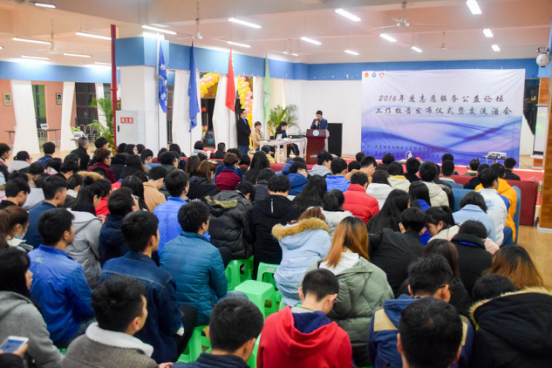 发布仪式由志愿者献词拉开序幕,志愿者们深情的朗诵表达了对志愿服务的热爱与自豪。我校志愿服务板块指导老师唐彬文在致开场词欢迎各位嘉宾、代表的到来后,全场起立奏唱《青年志愿者之歌》,现场的气氛庄重而热烈。随后校团委李文豹书记上台宣读重庆邮电大学移通学院2016年度志愿服务公益论坛工作报告。