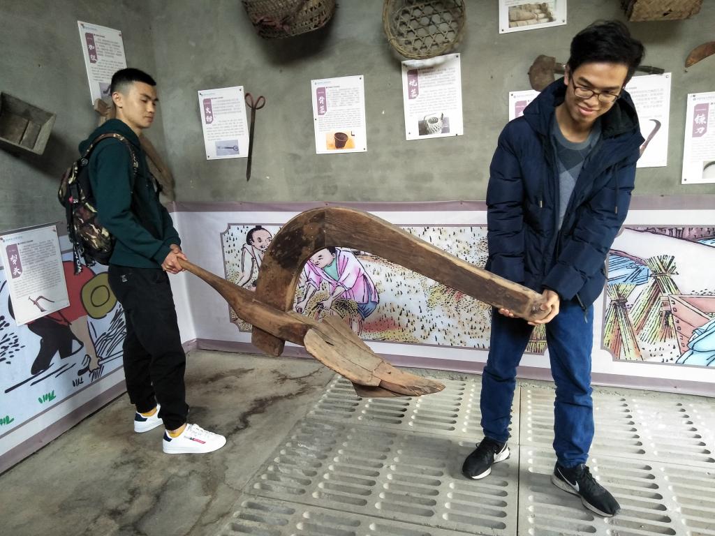 同学们在农耕协会讲解员的讲解下,依次参观了春种传统农具、夏长水利灌溉设备、秋收传统农具、冬藏粮储、谷物加工等传统农家劳作工具。墙壁上的农具带着古代先辈的精神与现代的我们相遇,这一瞬仿佛没有了时间与空间的隔阂,有的工具诞生至今已有了数千年的历史,但是这并没有妨碍其成为现代人与古代先辈的交流的桥梁,散发的古朴气息庄严而凝重,将先辈们劳作的身影跨过时间和空间投影到了这间略显拥挤的房间。同学们还亲自动手操作了风车、犁、耙、耘锄等农具。最令人印象深刻的是犁耙和风车,这些设备是用风力、人力、畜力为动力,用于汲水灌溉、加工粮食谷物的。巧夺天工的设计和使用方式,让同学们无不赞叹劳动人民的智慧。