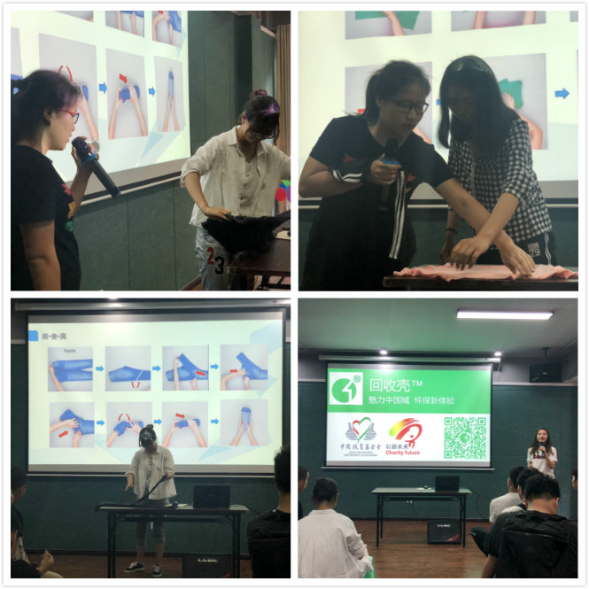 在对物品进行了筛选与判断之后,如何对剩下的物品进行收纳与整理,是大家要面对的第二个问题。通信与物联网工程学院的同学通过视频和现场教学的方式,向同学们进行衣物收纳的知识讲解。牛仔裤、短袖、夹克等衣物在经过新颖巧妙的折叠方式后,比传统折叠要节约三分之一的空间。在筛选与收纳之后,断舍离的第三个步骤便是让那些被筛选出的物品到真正需要他们的人的手上,重新焕发出光彩,成为真正有用之物。因此,此次活动特别邀请了回收壳的同学,在进行回收壳组织介绍的同时,也号召大家从自我做起,提高资源利用率。回收壳依托互联网为用户提供可再生资源回收,同学们在生活中舍弃的物品,可以通过回收壳进行回收,达到废物利用、环境保护、贫困帮扶等目的,真正实现物尽其用,使资源利用率最大最优。