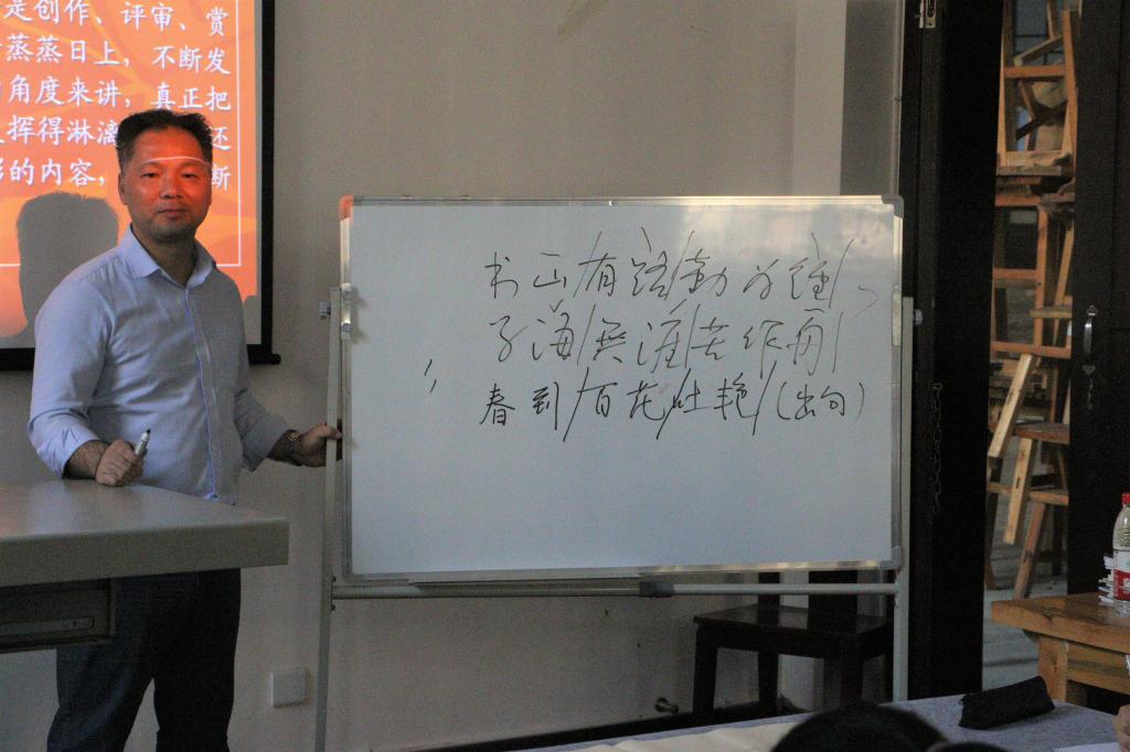 由浅至深,成就楹联达人。兰老师在讲解了基础性知识后,循序渐进为同学们引入更多的楹联要点,例如“合掌”、“仄起平收”、“领字”、“领句”等。而在理论知识讲解后实践操作也是必不可少的。秉着这样的理念,兰老师以一句“春到百花吐艳”为出句,同学们则根据所讲的楹联要素进行对句的探讨作答。在激烈的讨论中,同学们作出不少的对句,如“夏来万叶纷飞”、“秋来万木沉香”,“冬临千镇落哀”、“秋临万果送香”、“冬留万雪呈祥”、“风袭万野留香”……