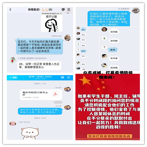 淬炼商学院按照移通委〔2020〕1号文要求,建立“横向到边、纵向到底、不留死角”的疫情防控工作责任体系,组建了“院领导+教研室主任+辅导员+专业教师+学生骨干”的5支防控队伍,以学院、年级、班级、小组、学生为主的4级管理网络,以班级防控为重点,夯实网格化管理,推动关口前移、触角延伸、重心下沉,真正实现疫情防控网格化。学院层面由学院领导作为主要负责人;年级层面由年级组长和各年级辅导员作为主要负责人,班导师协助辅导员做好相关工作;班级层面由班长作为主要负责人;小组层面由各主要班委、学生党员等作为负责人,最后是学生。通过层层压实责任,确保疫情防控期间的各项任务、要求都能一级级落实下去,守好疫情防控“最后一道防线”,不折不扣完成各级安排的任务。网格化管理,强化了学院与班级工作的协同,推动学院、班级联防联控工作更加到位,有利于对我院学生进行全覆盖无死角管理,为坚决打赢疫情防控阻击战提供坚强保障,同时也提升了我院学生管理工作水平。