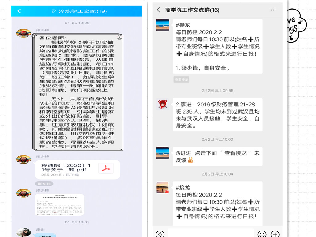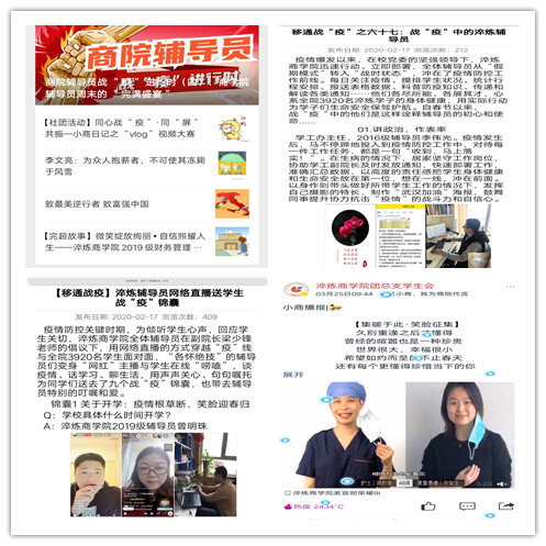 淬炼商学院根据“延迟开学不停教、不停学”有关部署要求,实施在线直播授课和线上辅导、讨论、答疑等活动,学院采取“辅导员+任课教师”的双线管理模式,通过辅导员对教学工作的介入确保了学生到位、思想统一,任课教师加入班级QQ群打通了沟通渠道,确保了教学的有效进行,实现了教学运行平稳有序、教师线上教学状况良好、线上教学效果明显、教学质量监控保障有力。师生坚持进行健康“日报告”和“零报告”报送,直播的形式开展线上主题年级会22次,制定心理危机干预工作方案,启动心理疏导和心理咨询热线,向学校申请对湖北籍家庭经济困难学生进行了2000元的资助,制定了就业工作预案,做好就业困难学生的就业补助申请工作和就业帮扶,为毕业生推送就业岗位1200余个,团干部对就业困难生结对进行帮扶,针对性送政策、送指导、送岗位,引导毕业生基层就业。积极谋划动员,组织开展了丰富多彩的线上完满教育活动,社团活动的vlog视频记录疫情生活,志愿服务开展“空中课堂”、花果培训和线上市民学校,艺术版块开展线上主持人大赛和戏剧节剧本征集,竞技体育开展21项完满励行记特别版之Keep打卡活动,吸引全院同学参与,不仅丰富了居家生活、坚定了战疫信心,也取得了较好的效果,得到学生家长好评。