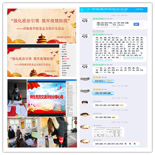 淬炼商学院按照移通委〔2020〕2号文要求,召开全体师生党员大会,学习文件讲话、传递精神要求、安排工作任务,号召全体党员要顾全大局、不畏艰险、冲锋在前、无私奉献,充分发挥基层党组织战斗堡垒作用和党员先锋模范作用。全体教师党员每天线上24小时随时到岗,做到“电脑不关机、手机不离身、停学不停教”,及时关心关爱每位学生,做学生的坚强后盾。师生党员自愿捐款支持新冠肺炎疫情防控工作,累计128人共捐款7010.9元,同时认购巫溪天元乡优质蜂蜜和农家香肠,助力脱贫攻坚和疫情防控。先后开展了全体党员“承诺接龙”活动,倡议接力活动、“理论入心·战疫必胜”为主题的学习强国APP挑战答题赛、“传递希望·三行情书”为主题的线上征文活动、“强化政治引领、筑牢疫情防线”等主题党日活动,凝聚党员力量,为打赢疫情防控阻击战助力。学生党员温宗航、杨俊瑞、刘岩、易千卜等10多名同志主动报名参与家乡的志愿者服务,担负劝导志愿者,环境消杀、防护知识宣传、政策措施解读、舆情引导等工作。有向学校捐赠消毒液、捐赠口罩的校友,有募捐25万抗疫物质亲送武汉的在校学生,淬炼商学院全体师生党员用实际行动践行着责任和担当,让党旗飘扬在防控战斗的最前线。