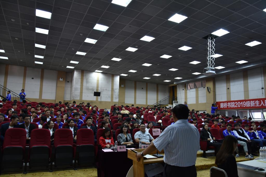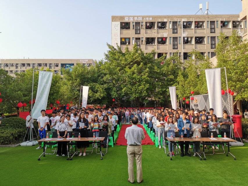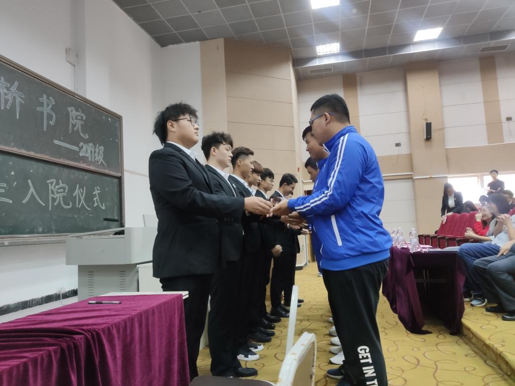 廊桥书院2019级新生入院仪式,是给新生的见面礼,也是新老交接的重大仪式,仪式共4项分新老主席团院旗交接、新老部长交接,新部长干事签订信任协议,以及学长团给新生颁发入院证书。