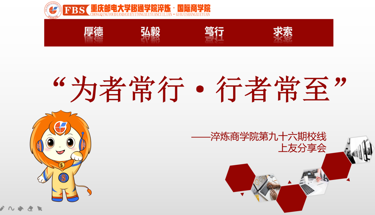 时间匆匆,“为者常行·行者常至”——第96期“校友·成才”主题论坛线上主题分享会圆满结束。本次分享会干货满满,不仅让在校学子了解了现在行业的发展更是为学子们指明了前进方向,让学子们拨开迷雾看清前路。在此,祝愿周熹校友的事业能有更好的发展,也祝愿淬炼商学院也能够桃李天下!