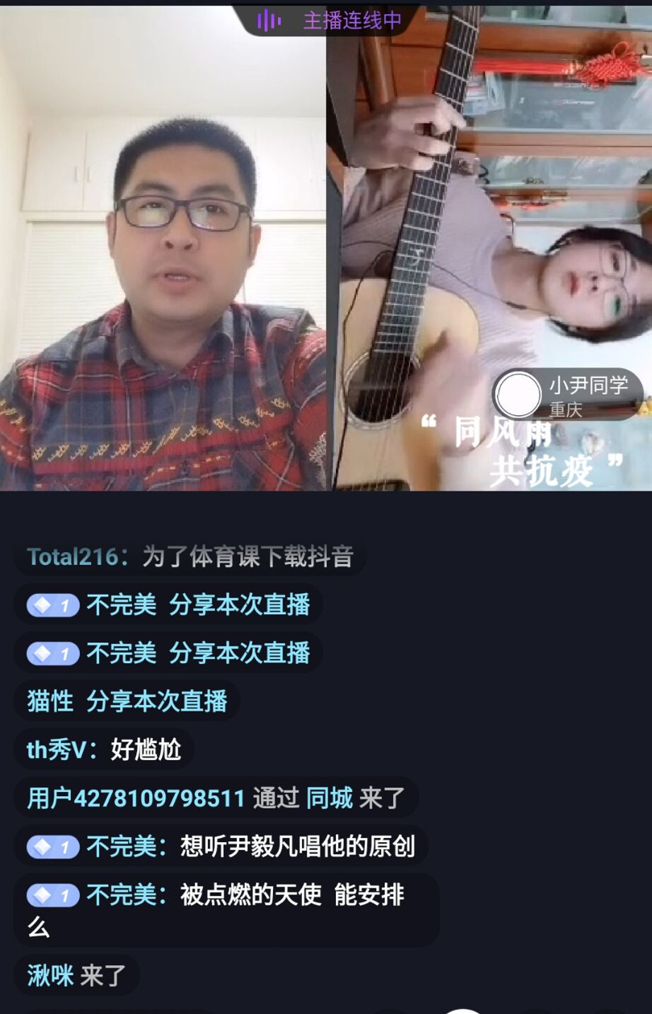 活动开场,尹毅凡同学以歌曲的形式为奋战在抗疫一线的医护人员送去深深的祝福,为后方坚守的人们传递信心和力量,让我们相信胜利属于我们。或许是因为许久未见,同学们都有些许害羞,在尹毅凡演唱了《没有人不比我快乐》、《忽然之间》两首歌曲后,气氛也逐渐进入高潮,评论区里送花朵,夸赞的声音也越来越多,大家好像又回到了学校在一起现场互动畅聊的时光。此外,尹毅凡同学宅家期间还自编了一首《被点燃的白色》,致敬白衣天使,
