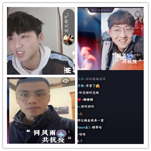 在活动中,歌手们用抖音直播为爱而唱,致敬英雄,共候春天如约而至。杨金演、谭豪演、伍荣豪等同学以自己的风格告诉了我们“黑夜,终究被逾越”,“春天,奏希望颂歌”,希望疫情早日结束,国泰民安。谭豪演同学演唱的《袖手旁观》唱出一种特别的力量,疫情面前,没有一位国人会袖手旁观,和我们祖国千千万万的子女一样,我们一同祈祷我们早日战胜这场没有硝烟的战争。全国上下各方人士更会齐心协力,众志成城,携手共渡难关。