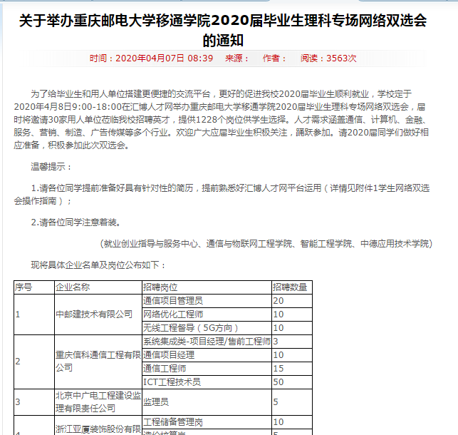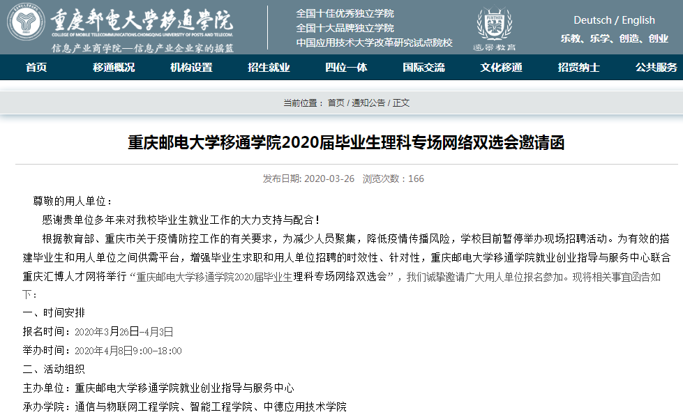 在经济持续下滑和疫情影响下,2020届毕业生的就业形势越发严峻。为了给毕业生和用人单位搭建更便捷的交流平台,更好的促进我校毕业生顺利就业,经就业创业指导与服务中心、通信与物联网工程学院、智能工程学院、中德应用技术学院近半月的筹备,4月8日,我校2020届毕业生理科专场网络双选会顺利开展。