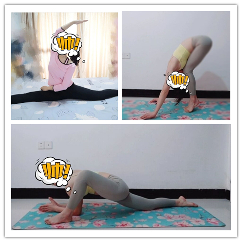 首先登场的这位同学,在瑜伽垫上做着熟练的动作,这么好的身材一定是因为长期保持锻炼的原因。再看这个轻松的劈叉,想必这位同学也是个“练家子”,虽然她害羞地用小贴图遮住了脸,但我猜一定是位气质美女,真让人羡慕呢。