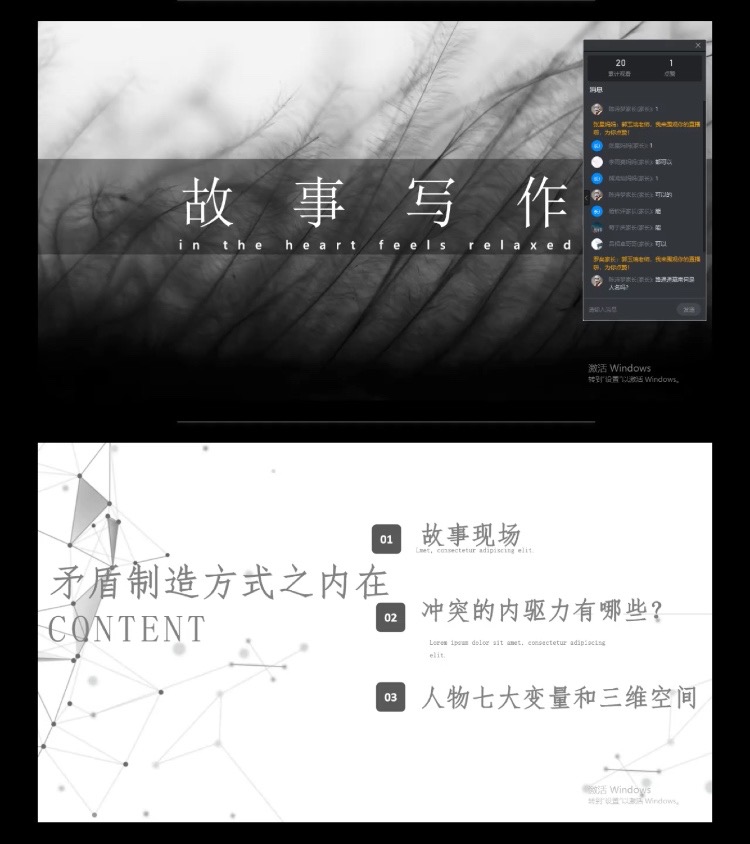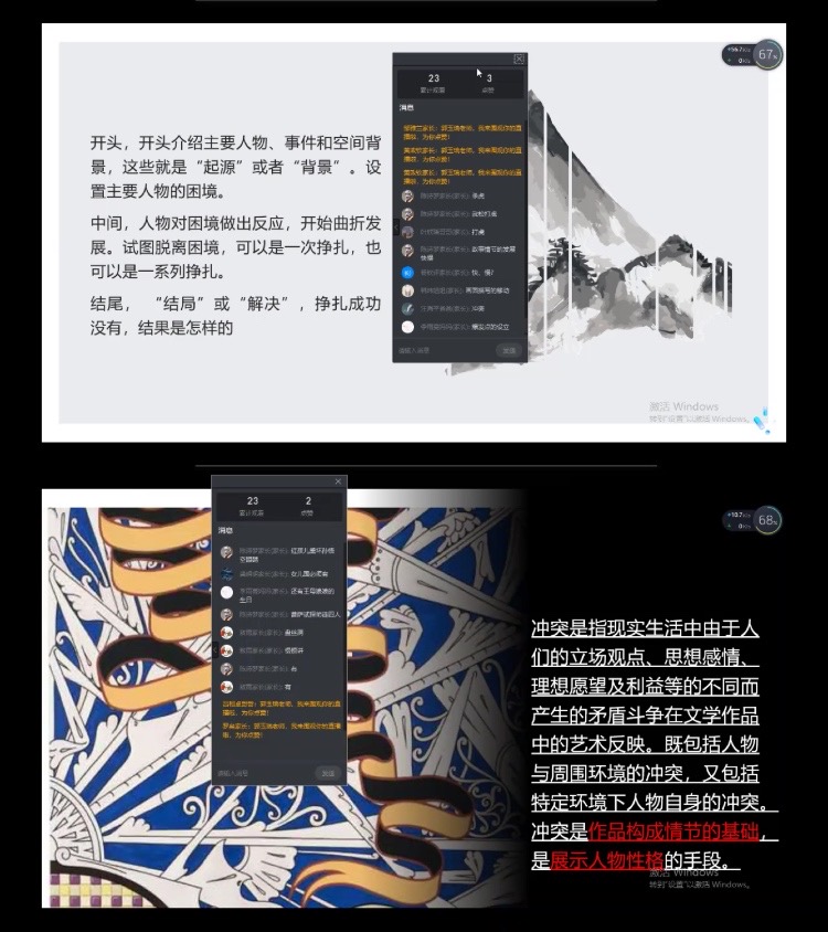 9点钟准时开课,这次郭老师为同学们带来了新的写作技巧——矛盾冲突。首先郭老师对上节课的内容——矛盾,进行了简短的回顾,之后非常自然地将话题引入了这堂课的内容。当讲到冲突时,郭老师先是提问,在《西游记》之中大家印象最深刻的是哪一关,大家的回答各不相同,例如女儿国、三打白骨精等等。郭老师接下来例举2003年大学里的小调查——四大名著里你最印象深刻的情节。由这个小调查的结果进一步推出了冲突的作用。
