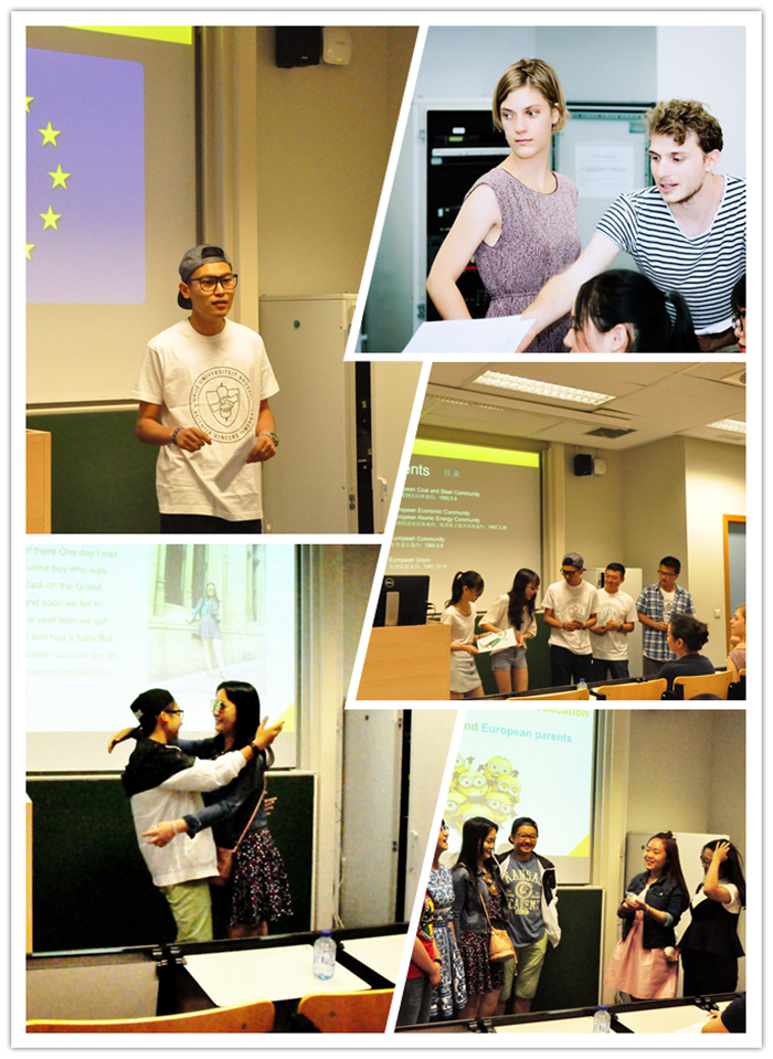 我们小组的演讲题目是欧盟的形成与发展。此前考虑到欧盟的主题专业性太强太过正式讲起来害怕听众觉得过于枯燥乏味,因此我们选择了情景剧的方式进行讲述。我担当主讲人,起到类似旁白的作用,以签订的条约为主线,贯穿欧盟的发展史,而小组其它人员则负责表演,每人代表一个欧盟创始国,讲述自己如何加入欧盟,为什么加入欧盟的原因。我们以幽默搞笑的形式营造出轻松愉悦的氛围,逗得座位上的老师和同学们哈哈大笑。不让大家在我们的演讲过程中打瞌睡这一点,显然我们做到了。当然,我们依旧有很多需要完善的地方,比如不够生动的语气,转换失误的道具,不够饱满的英语独白,拿捏不当的表演节奏。但是作为开门第一组,我们依旧收获了大家激烈的掌声,能够以不是特别地道流利的英语获得外语老师们的肯定,已经算迈出了很大一步。