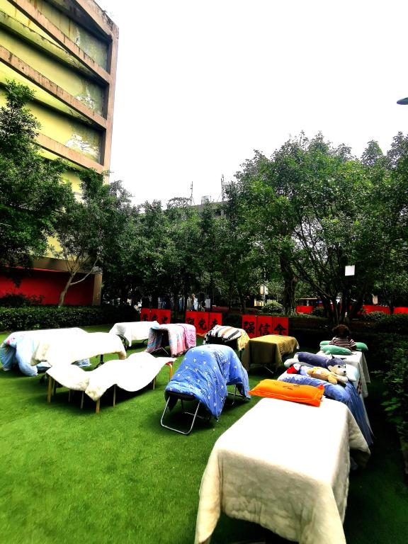 阳春布德泽,万物生光辉。由于重庆“雾都”的称号,常年气候潮湿,同时受假期疫情影响,爱莲书院的师生们坚决不让潮湿的被子成为阻碍学生健康的“绊脚石”。2021年9月10日,在爱莲小广场举办了“‘被’感温暖”家文化主题活动,想同学所想,做同学所做,几经商议爱莲确定了被子与阳光相遇的绝佳之地,布置桌椅,搭建一个属于被子的露营之地,与爱莲一起开启这趟被子的追光之旅。