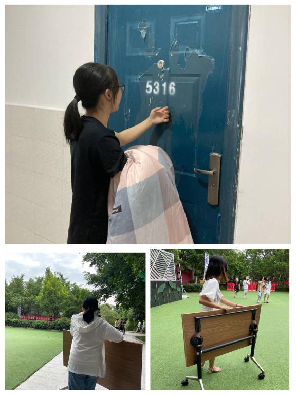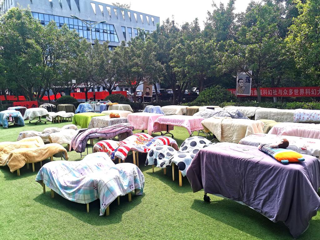 晨光微露,朝阳初升。早在活动开始前,爱莲书院就提前在官方QQ上发布了“一路有你,‘被’感温暖”推文,为活动进行预热。“太好了,我的被子终于有救了”“阳光续费,服务免费,爱莲真贴心”一时间,爱莲书院家人群里“炸开了锅”,同学们赞声一片。10日当天,天气格外的晴朗,书院工作人员和老师,从爱莲书院二号楼开始,给学子们提供上门服务,进行收被。与此同时,小广场上的晾晒平台也井然有序的准备着。为了防止出现被子丢失的状况,工作人员还贴心的为同学们发放一张专属于自己的标签,给每床被子烙上“印记”,保证被子都能够顺利“回家”。随着太阳不断上升,五颜六色的被子在书院以绿茵为底色的小广场上绽放,恰如爱莲与学子们的相得益彰。截止中午12点,爱莲共收到80多条晒被子“订单”。