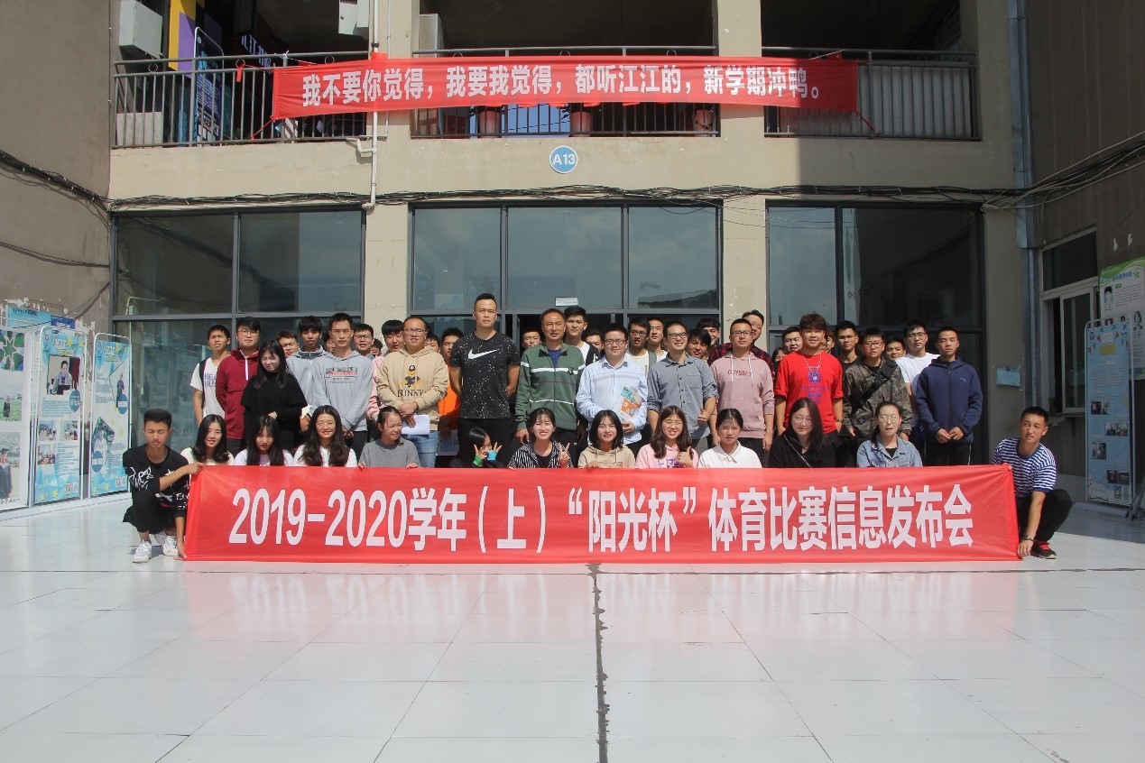10月18日中午,学生体育联合会于汇江多功能活动室召开2019-2020学年(上)“阳光杯”体育比赛信息发布会,介绍了“阳光杯”比赛相关事项。竞技体育中心负责人张永刚老师、体育训练部排球项目高川教练、篮球项目曾佳教练、体育活动部谈胜老师,学生裁判代表“2018-2019学年优秀学生裁判员”易忠诚,大赛竞赛组代表张钰漫,各院系竞技体育板块指导老师、分管主席及体育协会干部出席本次活动。