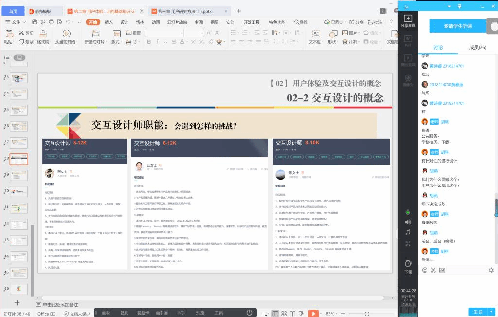 李主任首先认可了任课老师结合课程特性有针对性的选择授课方式。老师们就偏理论课程采取了“课件+自主学习”的线上授课方式。比如综合课程设计这类偏理论性的,需要启发思维,拓展思路的课程,廖国臣老师使用了色彩鲜明、内容简练、图文生动的ppt课件,配合高低起伏、抑扬顿挫的讲解,有效抓住学生注意力,同时在讲解过程中利用上台、连麦、摇一摇等方式与学生互动,进行头脑风暴,学生们的参与性都很高。