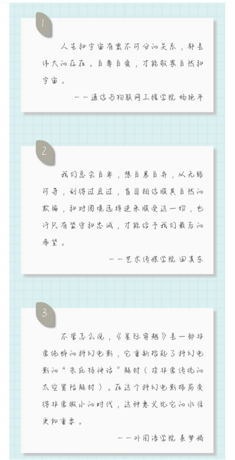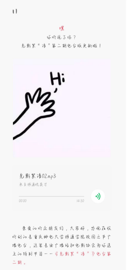 作为锻炼和交流移通学子映后写作能力的平台。“光影絮语”电子刊物在“疫情”期间总共推出了“疫情”特刊,“热爱这世界”特刊,“夏日青春”特刊总共三期,累计推送相关稿件近40篇,体现出了校园电影文化的普及与艺术修养氛围的提高。