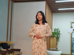 进入第二环节,十位参赛选手提前抽签决定分组,在承办方给出的5个时下热词——“赛博朋克”、“建党100周年”、“代孕”、“女权”、“抑郁症”中,现场进行舞台大屏幕随机抽选,最后根据所抽热词,每组进行现场3—5分钟主持。主题虽是临时抽取,但选手们依然台风稳健,发挥如常,配合默契,让人不禁叹服于选手们深厚的主持功底。随后,在打分组统计选手得分的间隙由淬炼·国际商学院的刘文蔚同学为现场的各位评委、观众以及选手带来了一首激昂的《Outside》,希望晋级的选手能够在第三轮再接再厉。最后经过激烈的角逐,五名选手成功进入第三轮。