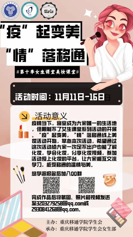 疫情之下,为丰富同学们的校园文化活动,让同学们在封寝期间也能积极学习美妆知识,重拾那个活力、昂扬的自己,第十季女生学堂特此推出“‘疫’起变美,‘情’落移通”美妆课堂活动。由于疫情,我们所有的活动只能由线下转为线上,但同时也是一次机会,让更多同学能够共同参与。本次美妆课堂超2000名同学共同参与,目前视频播放量超50W,参与率与收视率双创新高!今年的美妆课堂,注定不一样。
