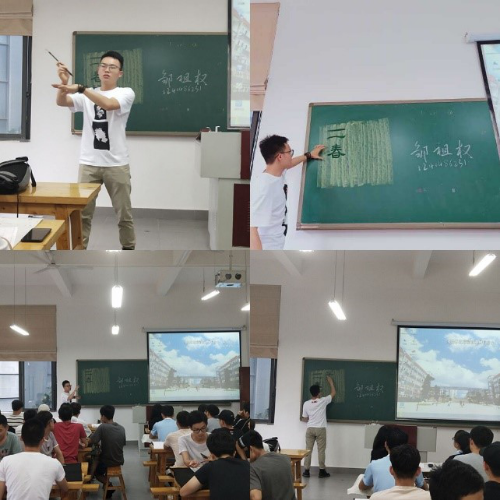 在本次活动中,联合学校书法协会的邹祖权社长为大家讲解了一些关于使用毛笔的基础知识,并且还在黑板上以粉笔涂过的地方为纸,以水为墨,在黑板上为大家展示基础的笔画和几个简单汉字的基本写法。参加活动的同学们在感叹社长的行云流水之际,顿时也激起同学们学习书法的热情。