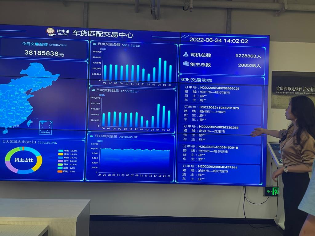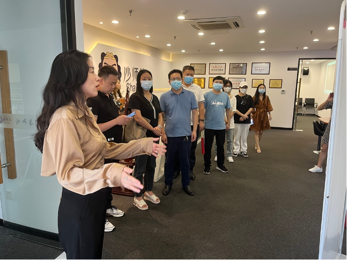 在工作人员的带领下,王副校长一行进入到沙师弟公司的主要工作区进行参观,工作人员对于沙师弟的运营、研发、物流等各个部门进行了详尽的介绍和讲解,通过研发部墙上两块公司自主设计的大屏,可以清楚的了解到“沙师弟”平台实时和累计的活跃人数以及交易状况,让各位来宾零距离感受大数据的“魅力”。