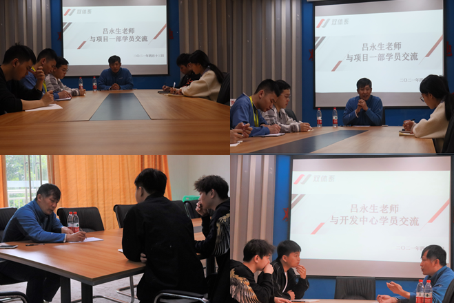 2021年4月12日-14日,双体系创始人吕永生老师莅临我校双体系卓越人才教育基地进行了为期三天的交流指导。期间就教师授课技巧、学生项目指导、双体系大事记回顾等工作,分别与职场、技术老师们进行了交流探讨,并对项目部学员、开发中心学员做出了专业指导。