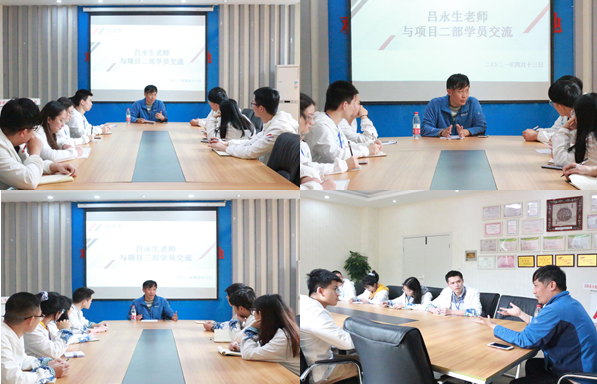 4月13日上午9点,吕永生老师与项目一部及开发中心的学员们进行一对一交流,对于大家学习中遇到的问题进行答疑解惑,对大家未来发展的职业进行分析、提出建议。吕永生老师告诉大家,在学习过程中兴趣是很重要的,但是兴趣是基于成就感而来的,所以在学习中需要制定一个目标,带着完成这个目标去学习,在成功一次之后就能产生对学习的兴趣。但是在学习过程中也会有失败的时候,这个时候需要学会调节自己的心情,不能轻易地放弃,对于自己不会的知识点要能够拆解分析。最后吕永生老师说到,在走上职业岗位之前,学员们要尽量的多学习多尝试,相信总有一个岗位适合自己。