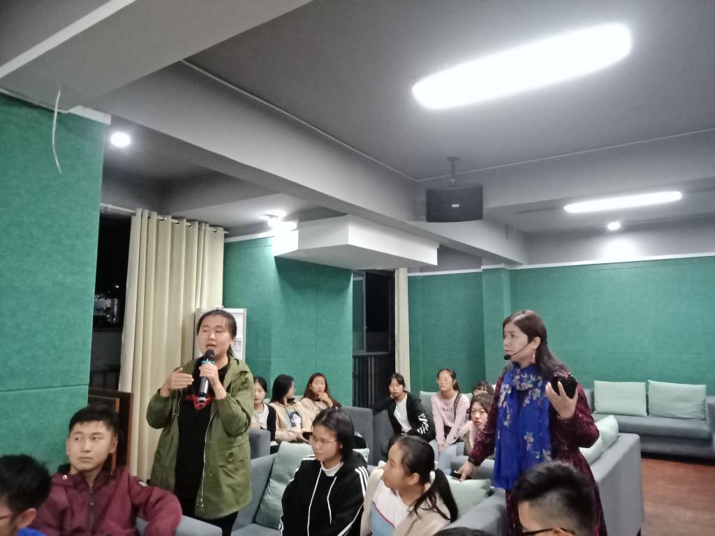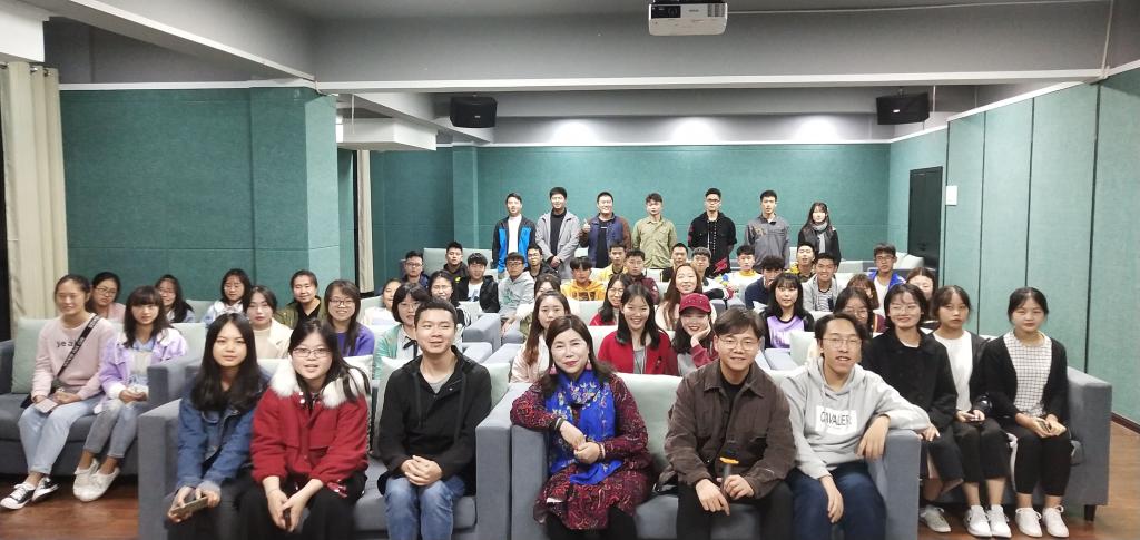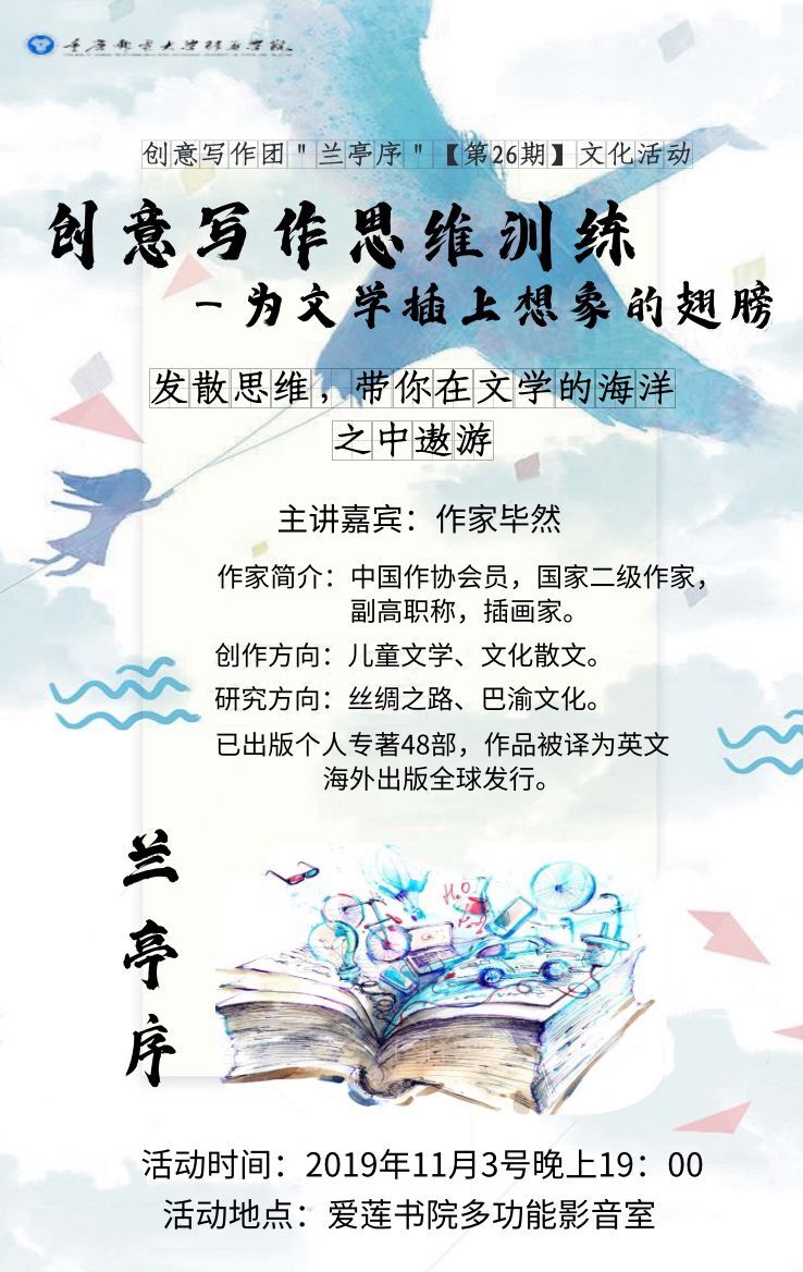11月3日,周日的晚上,一些喜欢写作、慕名而来的学生来到了爱莲书院,由本校创意写作团举办的“兰亭叙”系列文化活动在 C4一楼的多功能影音室正式开启。兰亭叙文化活动从2015年开始,至今已经举办了26期,每个月都有关于文学、写作的主题活动,聘请作家、学者与学生交流互动,深受学生的好评。本期兰亭叙活动由创意写作学院的毕然老师主讲,毕然老师是创意写作团的指导老师,连续两年获得“优秀社团指导老师”。她从12岁开始写诗,至今从事写作多年,出版过48部文学作品。在创意写作学院是教龄最长的老师,有着丰富的教学经验,获得过“远景百万优秀教师”和“创意写作重大贡献奖”。此次兰亭叙的主题是毕然老师针对学生在写作方面出现的瓶颈状态,从欧美的创意写作训练得到的启发,从创意写作的思维训练着手,旨在开启学生写作的翅膀。