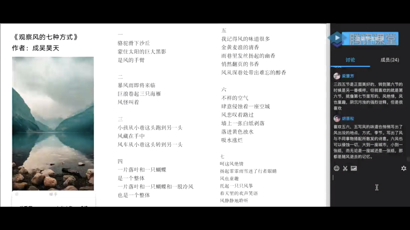 5月1日晚上,创意写作学院2019级作家班诗歌工坊的同学们齐聚网课教室,伴随着优美舒缓的背景音乐,开始了《诗歌工坊》的学习。上堂课,苏瓷瓷老师布置了以《观察____的____种方式》为题,仿写华莱士·斯蒂文斯的《观察黑鸟的十三种方式》作业——经过一周的等待,今天就到了检验我们的学习成果、讲评同学们原创诗歌的时候了。这堂课展示顺序以同学们交作业的时间先后排列。作者在线朗诵后,由同学们通过连麦交流、讨论区发言等方式作出对该诗歌的评价,最后由苏瓷瓷老师予以总结。