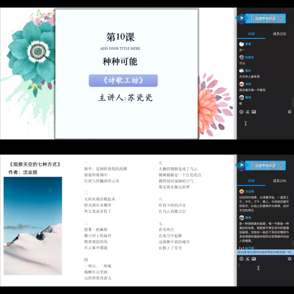 学习的时间在不知不觉中溜走,本堂课总计展示了七位学生的原创诗歌。苏瓷瓷老师在总结本次课堂所学的同时,表达了对同学们后续诗歌创作的期望。同种题材,种种可能,诗歌创作的世界是丰富多彩且永无止境的。虽然疫情把我们的身体锁在家中无法外出,但我们的思维仍能在文学的广阔天地中自由的飞翔!