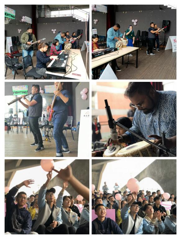 三首不同风格的演唱歌曲,展现了我校学生的多才多艺。完满教育,为大家提供一个个展现自我的舞台,使我们有更多的机会把自己青春向上的一面展现给外国友人。来自马来西亚的NADIR乐队作为此次活动的特邀嘉宾,在欣赏完三位同学的表演后,也开始了自己的压轴表演。电吉他、手鼓、贝斯、萨克斯、键盘等多乐器的结合,马来语、英语、印地语多语言共同唱响,音乐此时没有边界,大家积极互动拍起手掌,用热情的节奏表达自己对音乐的喜爱和对外国友人的欢迎,以一颗炽热的心,一起奏响这场多元文化的音乐盛宴。