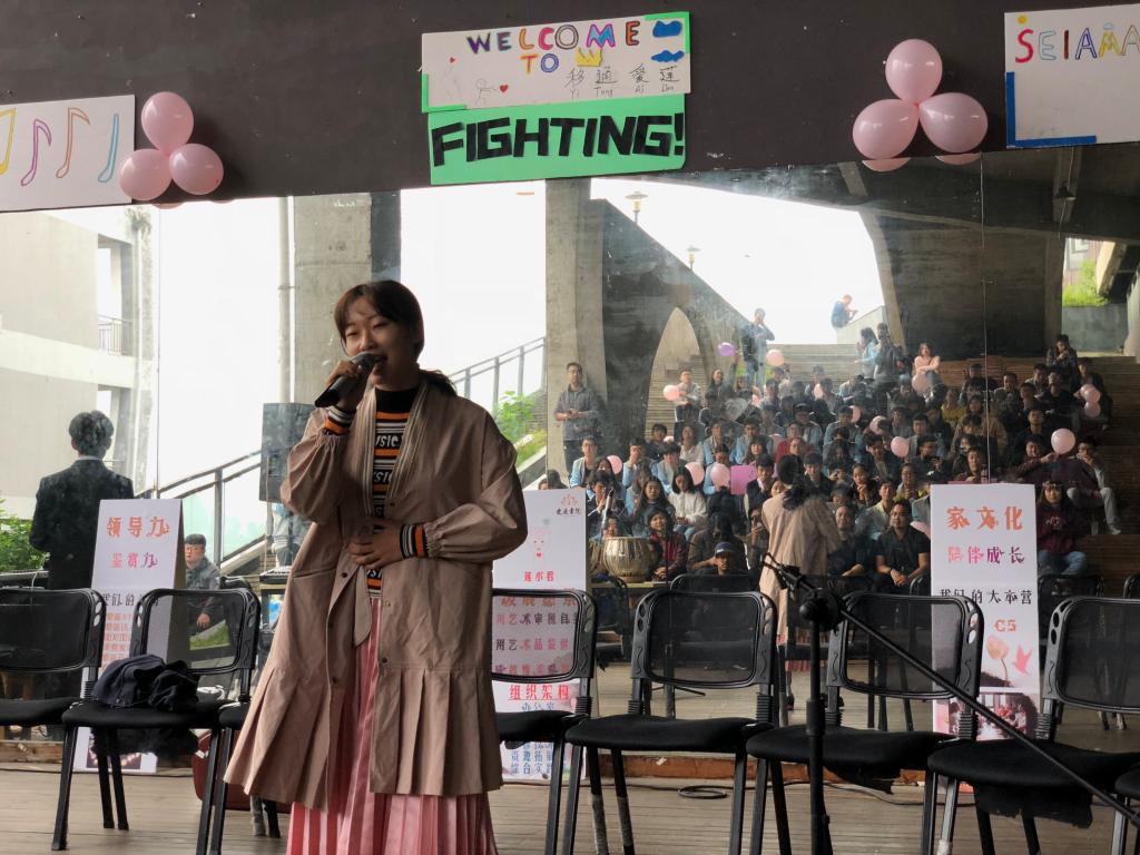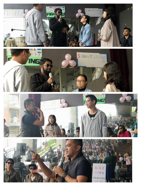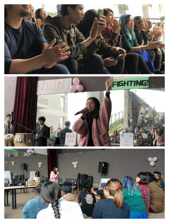现场同学们特意用马来语装扮的欢迎你们,让马来西亚乐队的朋友们倍感亲切,乐队人员调音完毕后,活动正式开始。由张元凯同学演唱的粤语歌曲《遥远的她》,一开口便将现场的氛围迅速点燃。《遥远的她》原曲是谷村新司于1985年发行的《浪漫铁道》,原词与爱情无关而是表达了独行的思考。经过潘源良填词后讲述了一个凄美的爱情故事,故事女主患病逝后男主表达对她的怀念。男主的娓娓道来,赋予了这首歌新的灵魂。