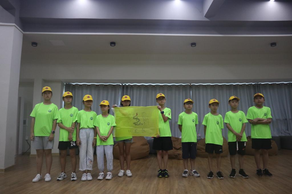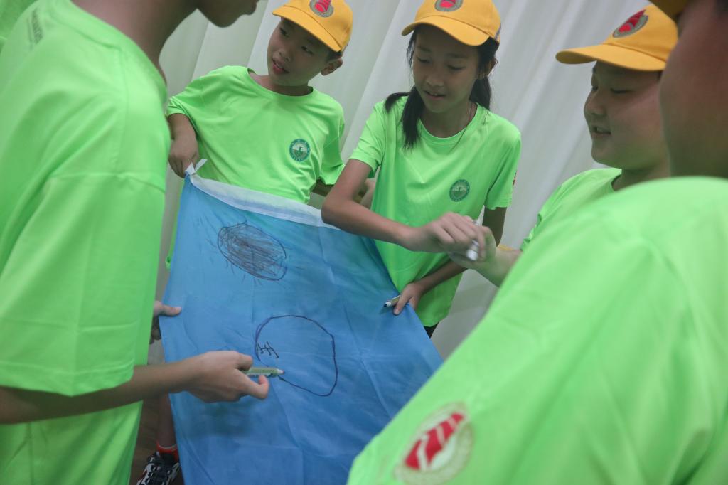 教练将小朋友们分为了三队,要求小朋友们在一定时间内确定自己的队名和口号以及设计队旗,队歌。小朋友们毫不胆怯,一拍即合做好分工,不一会儿各个队伍相继完成了任务。