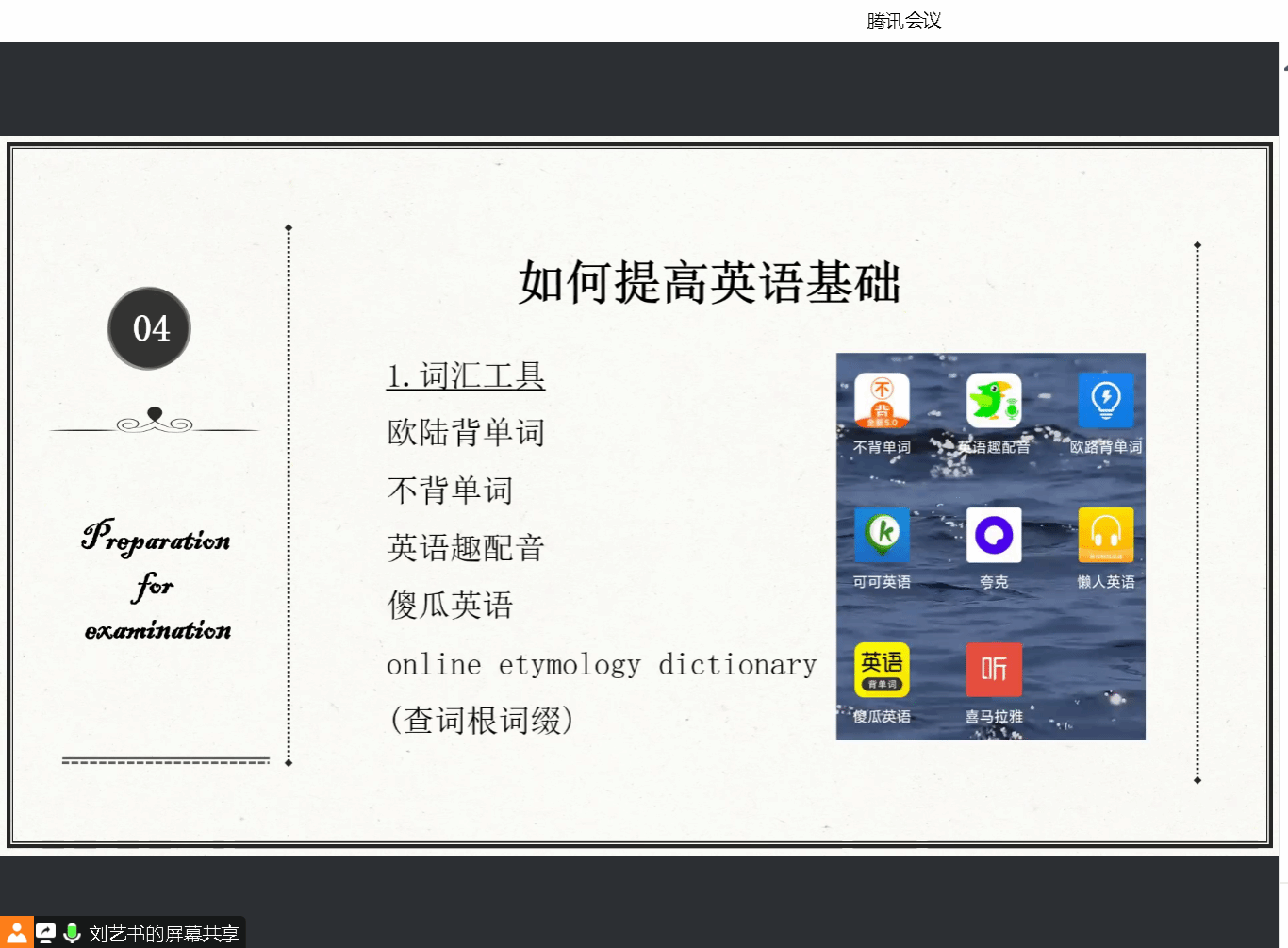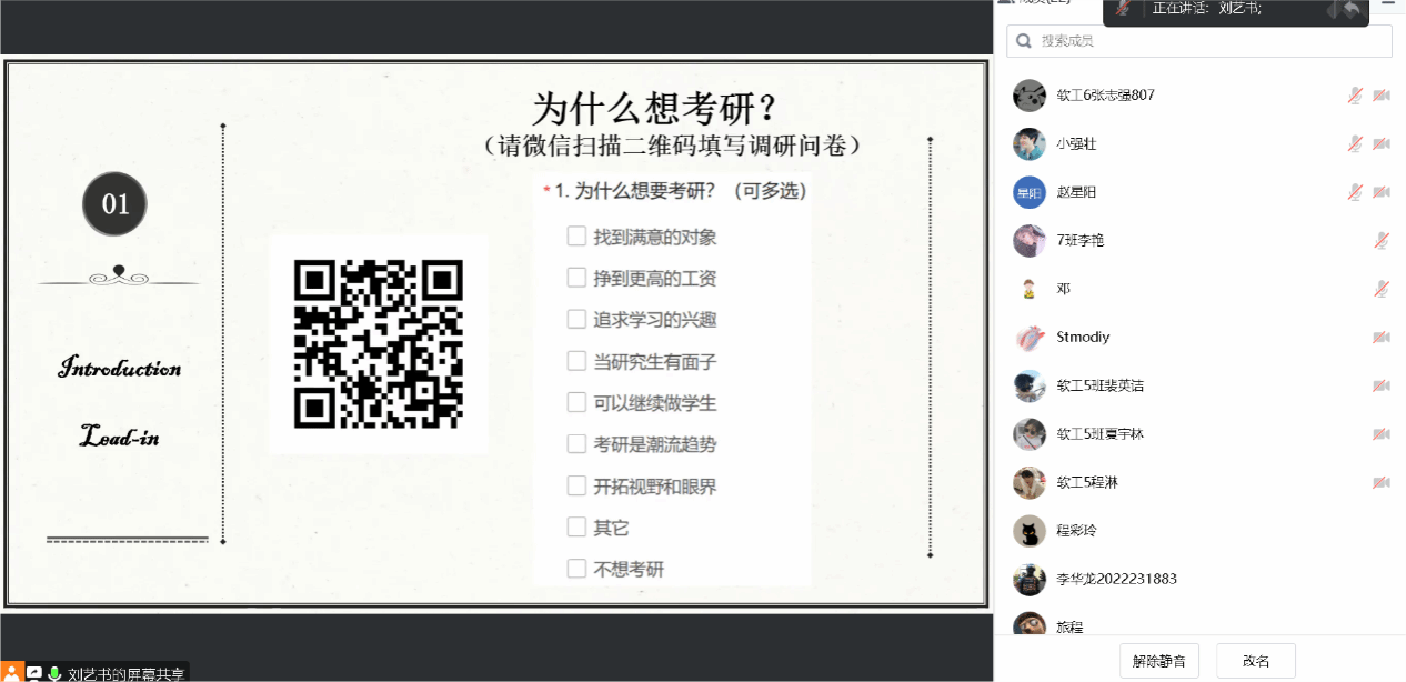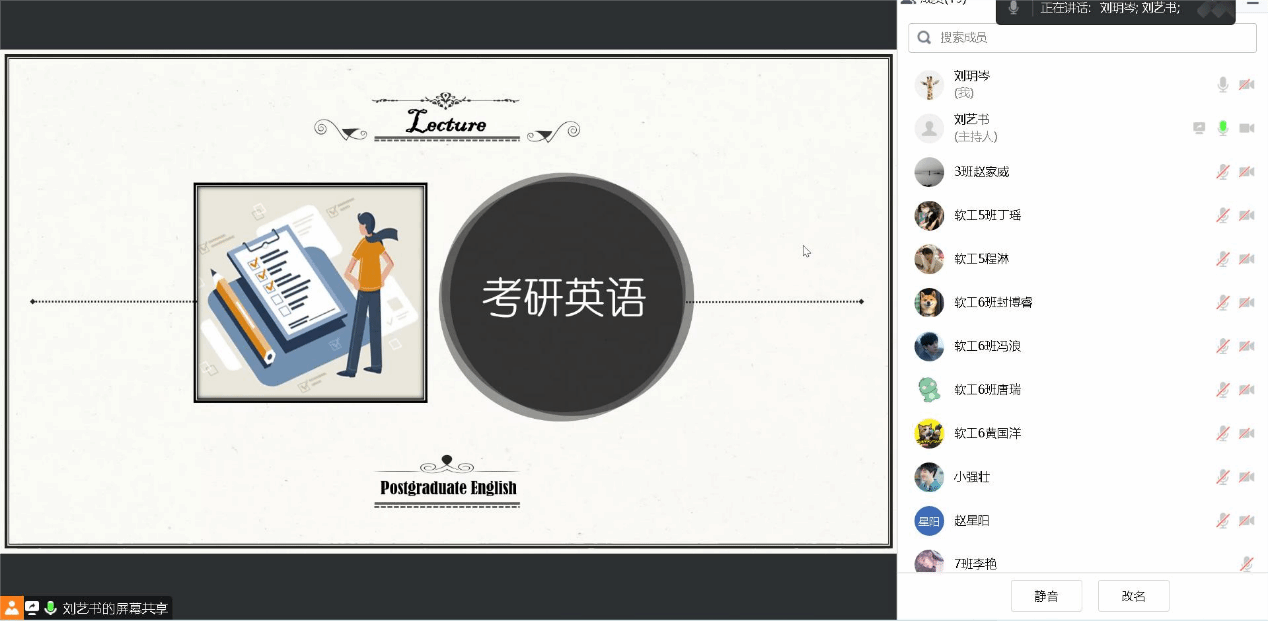 为进一步加强学风建设,提高考研学子的备考信心,夯实英语基础知识,提高英语复习效率,2022级软工专升本7、8班异科导师刘玥岑邀请外国语学院刘艺书老师于4月26日在腾讯会议为同学们进行了“助考研,促学风”线上考研英语专题讲座。讲座由刘玥岑老师主持,刘艺书老师主讲,同时邀请了邓璐、程彩玲、单旭燕和邓娟老师的部分异科学生参加了本次讲座。