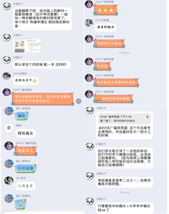 在老师分享结束后,同学们在线上就老师提出的观点积极的讨论了三小时之久,在这三小时之中,老师和学长学姐们不曾离开,一直耐心解答同学们的问题,并对刚才的分享又作了更深的补充。同学们就如何选择考研专业,择怎样的培训班以及复习备战的过程中遇到的各种问题应该如何解决向三位学长学姐各老师寻求建议。学长学姐和老师对同学们提出的问题作出了详细的解答。