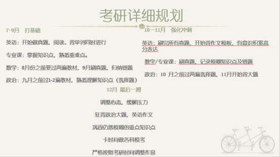 首先分享的2016级英语专业的古月同学。一开始,她先是强调在决定考研时,必须了解这是一条怎样的路并坚持下去。古月同学分析了2020年的考研形式以及扩招名额专业分布等情况。接着,她又分享了自己的考研详细规划(图一)。最后,她给了正在备战的同学们一切调整心态的方法,从自己决定考研的原因以及在考研艰难期的,心态是如何调整的办法。