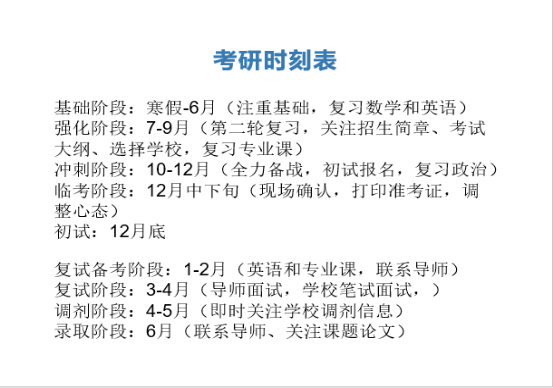 接着分享的是的闫令同学,闫令同学分享一些大家在决定考研时需要了解的考研常识:国家线,A、B类考生,跨考等。接着学长分享了自己的考研时刻表(如图二)。以及带着同学们分析考研各科目应该如何去准备并根据自己的经验给出了相关建议(如图三),最后推荐给同学们自己考研时关注并对自己提供到帮助的微信公众号。