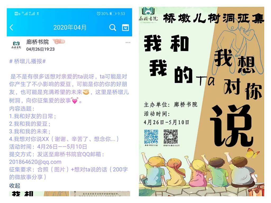 廊桥书院在结合书院家文化氛围营造的同时,倡导大家用图文的形式表达出心中的爱,每个时代背景下,不同的时代的人表达自己的爱意都是不同的;4月26日,结合母亲节,以“我和我的ta” VS“mother·我想对你说XX”为主题的图文征集正式启动,采用线上征集、展示的形式,倡导青年学子们大声、勇敢的说出心中的爱。