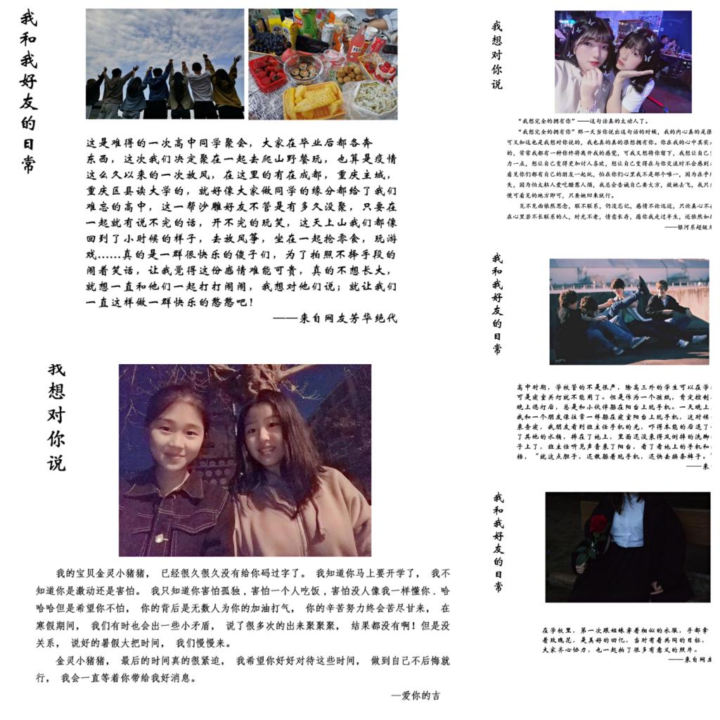 “桃花潭水深千尺,不及汪伦送我情”,早在两千多年前,李白在与好友汪伦赠别时挥笔写下的两句诗,感人肺腑,久传至今。而在第一章节中,主题为“我和我好友的日常”,通过两周的征集,大家纷纷晒出自己心中的好友,其中多为高中时期的美好回忆,在度过今时今日的美好时刻,不忘昔日好友,让友谊沉淀于岁月,柔和于岁月,此时,更想对他(她)说一句:“嗨,你还好吗?”