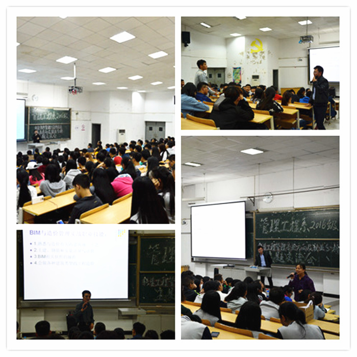 与此同时,在3103教室,管理工程系工程管理专业2016级新生交流会也在如火如荼的进行中。交流会以建设工程领域国家大方针及专业发展趋势为背景,以工程管理专业在专业课程体系与专业岗位对接为核心主题,以BIM和建筑工业化的大趋势为引导,从专业课程理论和实践学习相结合及就业方向上进行分析及引导。系部专职教师刘霖老师代表工程管理专业教研室全体教师做了“致青春——2016级工程管理专业方向与就业形势”的主题分享。就工程管理专业大一新生可能存在的四个问题:“我为什么要上大学?”“工程管理学什么?”“如何丰富大学生活?”“未来需要什么样的人才?”进行了详细的解读。刘老师用风趣的语言、大量的案例,并结合自身经历从各个方面与同学们进行了交流,同学们认真聆听,现场氛围热烈。