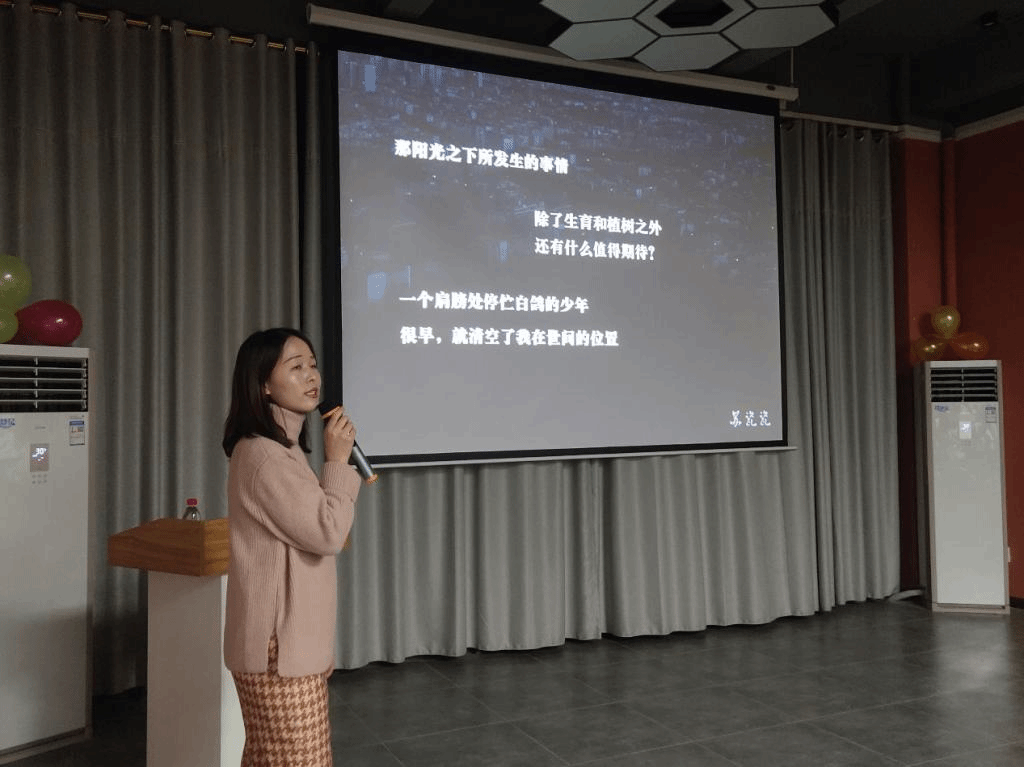 颁奖典礼结束,进入本次活动的第二个环节——诗歌朗诵。为了欢迎苏瓷瓷老师的到来,文学社指导教师吴霞霞老师上台朗诵了苏老师的经典诗作《晚安曲》。吴老师用她的家乡话——甘肃方言朗诵这首诗歌,使得活动现场仿佛走进了一幕徐徐展开的文艺电影,沉郁,荒凉,粗粝但动人,引起现场掌声雷动。之后,张伟老师也欣然上台,朗诵了自己创作的诗歌《给苏瓷瓷》,“我感到你是预言家\你满意地发笑\灰尘只能在你周围安静地落下。”在两位老师动情的诗歌朗读中,全场气氛已然高涨。