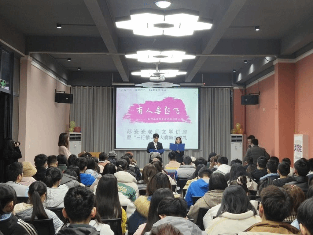 12月12日晚上7点,由创意写作学院主办、三江文学社和廊桥书院学生自治委员会承办的第2期 “香樟树下”主题文学讲座活动在别都书院「四维空间」开展。本次活动主题为《有人要起飞——如何从日常生活寻找创作主题》,为帮助同学们在创作之前从日常生活寻找到创作主题,我们特邀著名诗人、80后实力派小说家苏瓷瓷前来担任主讲嘉宾。
