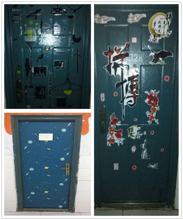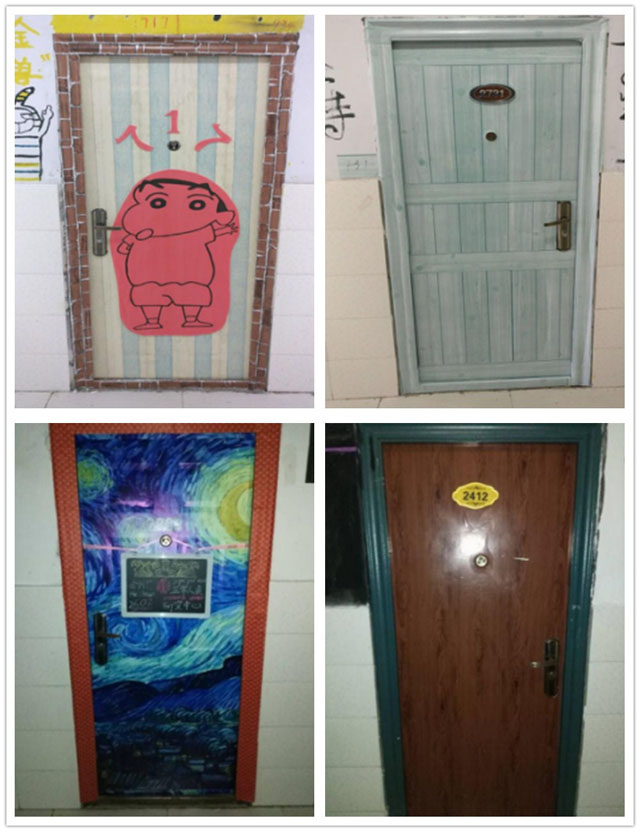学生宿舍门装饰中都着力于环保手工制作,充分发挥想象力和手工劳动力,以作品表达了同舍成员的共性和各个舍员的个性,展现其良好的风采。在宿舍门装扮中,舍友之间相互配合,或挥毫泼墨,书就先贤名言;或画笔细描,勾勒出心中所想,利用课余时间将宿舍门装饰得焕然一新,使各个宿舍门都有其独特的风格和内涵。
