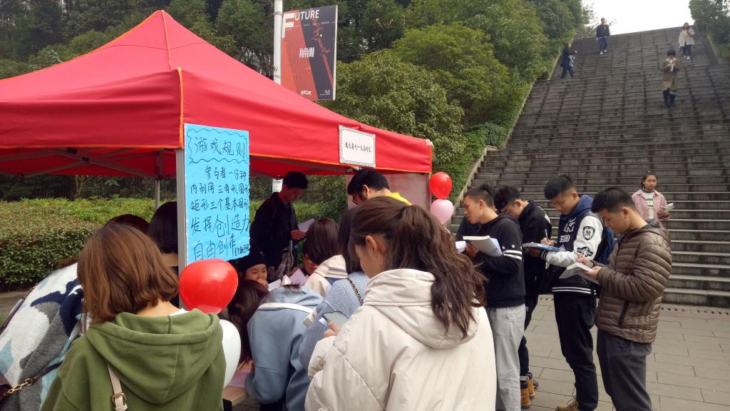 与周遭喧嚣完全不同、十分安静的一处游戏点吸引了大家的注意,“天马行空”游戏要求参与者在一分钟内用三角形、圆形、矩形三个基本图形,发挥创造力进行自由创作,拼出一幅画。看似简单的线条和图形,却因十分考验同学们的创造力而颇具特色。每个同学都在认真思考,力求用简洁的图形表现丰富的画作内涵。