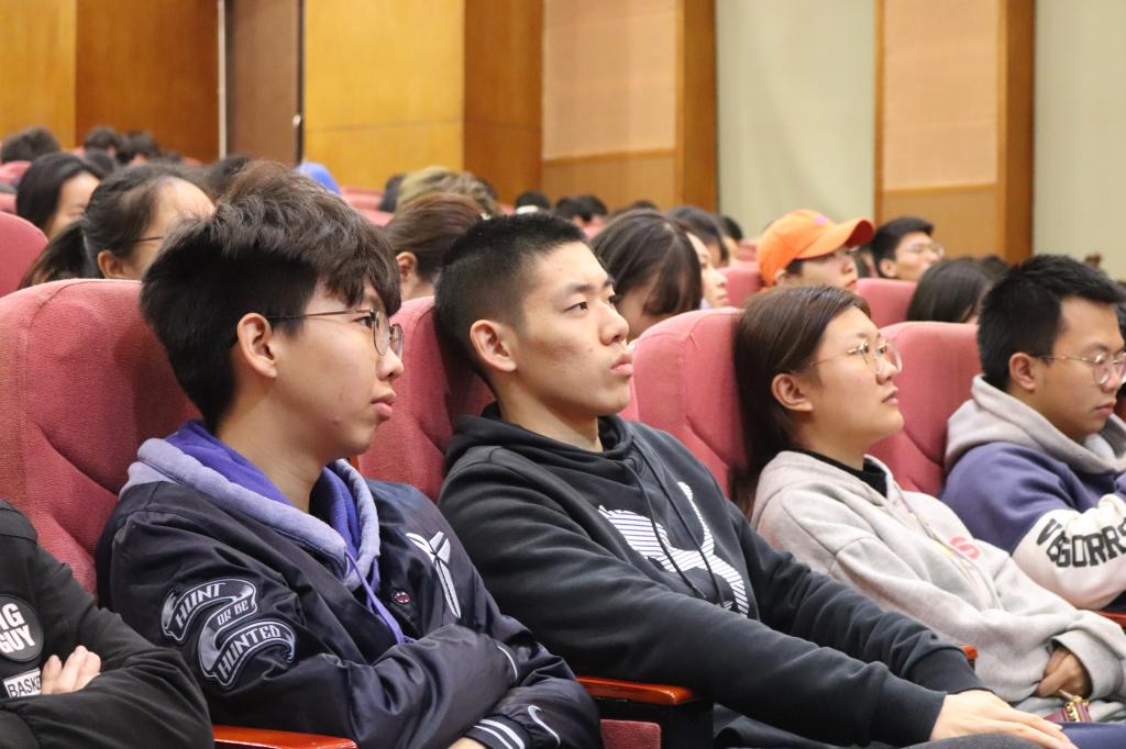 姬大成先生问了同学们一个问题:“快乐来自哪里?”在场的很多同学都说出了自己的想法,有说“暴富”、“不挂科”的,也有说“打游戏”、“购物”的,但这都只是片面的。真正的快乐来自于给予,这是自己能够创造出来的。人类是社会动物,人类的存在价值来自于社会。快乐需要奉献,不论大小,也许只是对身边人的一个小小的夸奖,这都是奉献,也是让人快乐的源泉。
