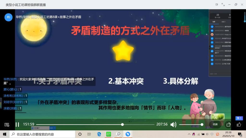 2020年2月28日周五晚,类型小说工坊的19名学生满怀期待的开始了新学期的第一课学习。大家第一次通过线上的方式交流学习,在感到新鲜的同时,也有些许惶恐。但是类型小说工坊导师、作家毕然老师亲切和蔼、诲人不倦的态度,似朋友视频聊天一样的氛围,让我们安下了心,钉钉线上课堂的氛围也恢复了往常在学院北山斋教室上课般的轻松、活跃而愉快的气氛。每周五晚上,即使连上四节课,没有同学流露出任何怨言,反而大家都特别期待每周五的《类型小说工坊》课和《故事写作》课。