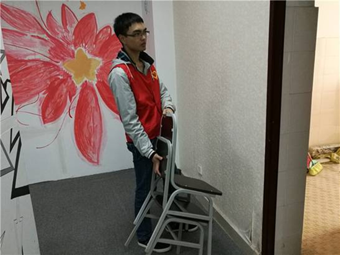 书桌和椅子,在自习室是天生一对。搬椅子,这自然是男生的强项,男生便毫不犹豫地上前搬椅子,但女生们也毫不示弱,协助男生去搬椅子和安放椅子,男女搭配,活动进行十分有序。这些志愿者们素质很高,不仅有分工,而且在搬运过程中轻拿轻放,男生们更加干劲十足,从楼上到楼下,一鼓作气,在这短短的过程中,团结和协作,再一次的彰显了出来。