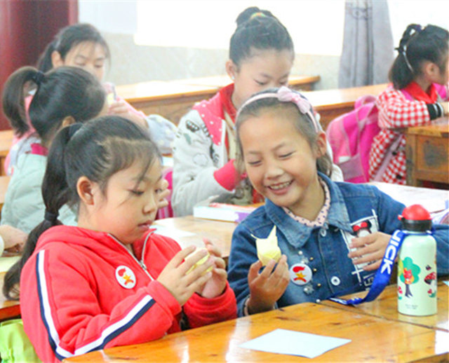 对于小孩子而言,欢乐与自由是无尽的“诱惑”。在手工课堂上,千纸鹤的制作也成了一道亮丽的风景线,他们小心翼翼的折着手中的彩纸,一步一步的,在支教老师的指导下,他们一步一步跟着做,当成功地完成之后,他们露出了洋溢地笑容,还有一位小朋友激动地跳起来说:“我做好了!”瞬间,所有的小朋友都对他投来羡慕的眼光,老师此时也露出了满意的笑容。