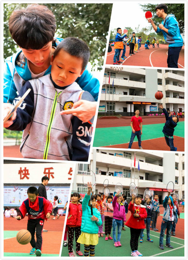 天空虽灰蒙蒙的,却没有降低小朋友们想打乒乓球的欲望,在支教老师的带领下,一队小朋友在乒乓球的舞台上正在进行一场激烈的“厮杀”。看!那两个帅气的小男孩目不转睛的盯着腾飞的乒乓球,是那样的专注,又是那样的欢乐,羽毛球队的队员们也是意气风发,他们手举羽毛球拍,在老师的指导下挥动着……篮球队的也不甘示弱,他们拍动着手中的球,他们在一起,尽情的体验那短暂且欢乐的时光。