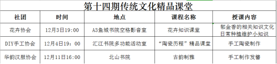 第十三期传统文化精品课堂已圆满结束,希望来到传统文化小课堂的同学珍惜学习机会,共同推动传统文化,弘扬中华优秀传统文化。第十四期精品课堂将以花卉知识、陶瓷制作、手工教学三门课程为主要方向,讲更多的文化带入校园、带入课堂。